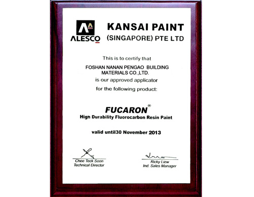 • 氟碳漆頒發證書